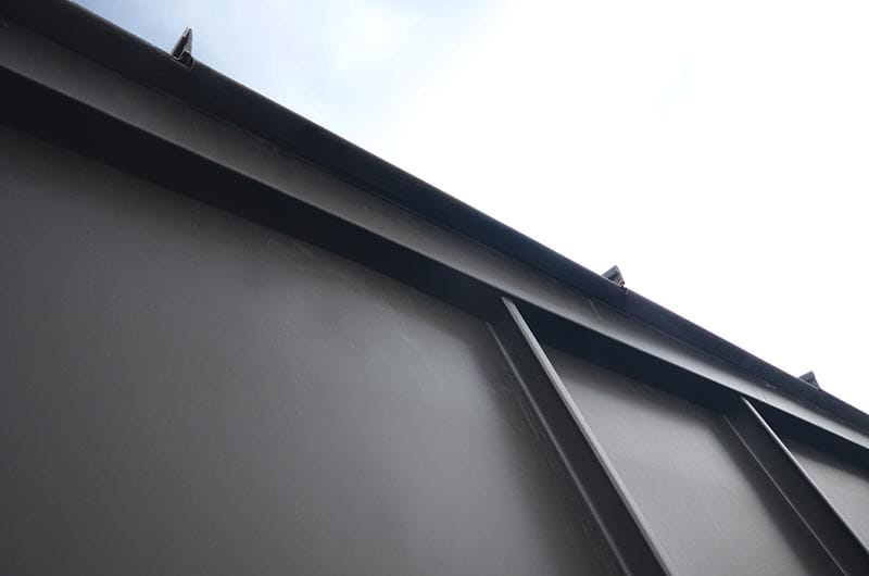 Après les travaux de montage de l’ossature bois, il faut couvrir la maison et la rendre étanche. Les clients avec le conseil de l’architecte, ont souhaité une couverture en zinc traité anthracite Anthra-zinc® en harmonie avec les menuiseries noires réalisées sur mesure.