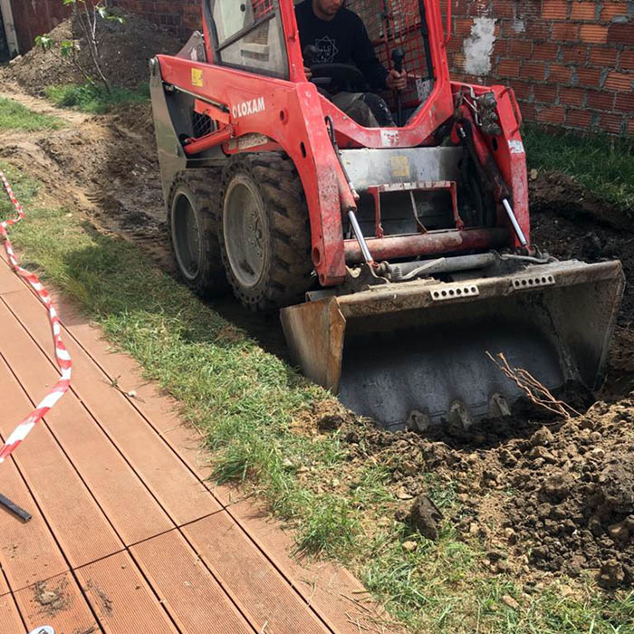 Après décaissement du terrain de 30 centimètres par une mini pelle, le coffrage de la dalle est mise en place. Un ceinturage armé plus profond sert de fondation à cette dalle.