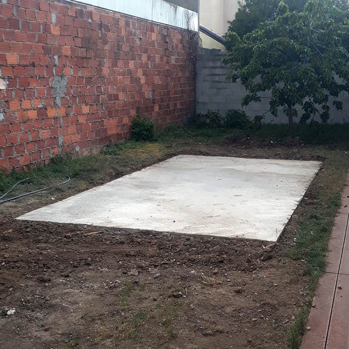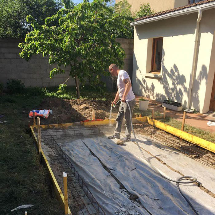 La grave concassée est arrosée sur l’ensemble du ceinturage, le ferraillage du centre de la dalle est fixé, le coulage de la dalle peut commencer, entre 15 à 20 cm d’épaisseur en une traite, puis lissée. En fin de journée, nous emmenons les gravats triés en décharge légalisée.