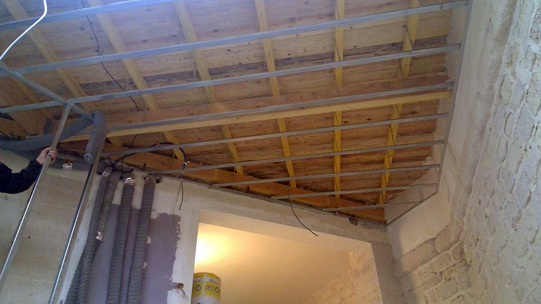 • Faux plafond en BA13 phonique et doublage en laine de verre (30cm).