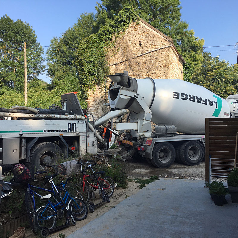 Après la préparation du sol et son isolation, le passage des évacuations, le ferraillage, la dalle est coulée dans la matinée avec une toupie de béton.