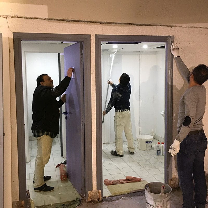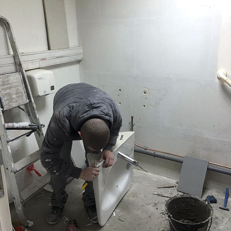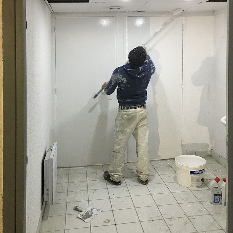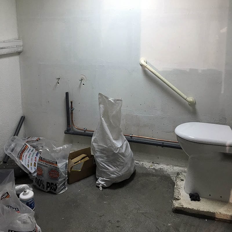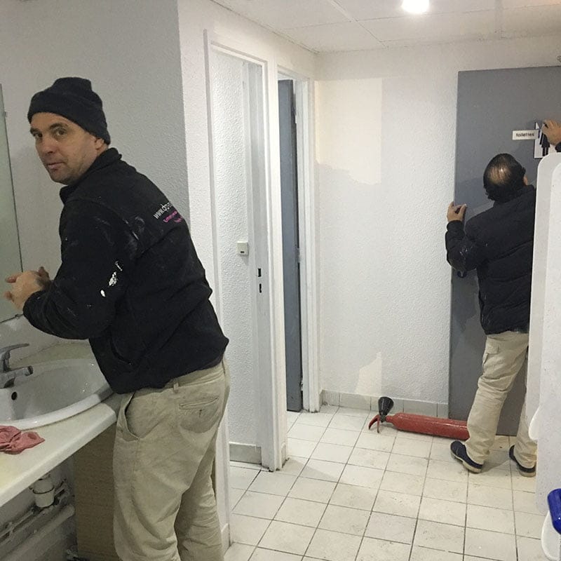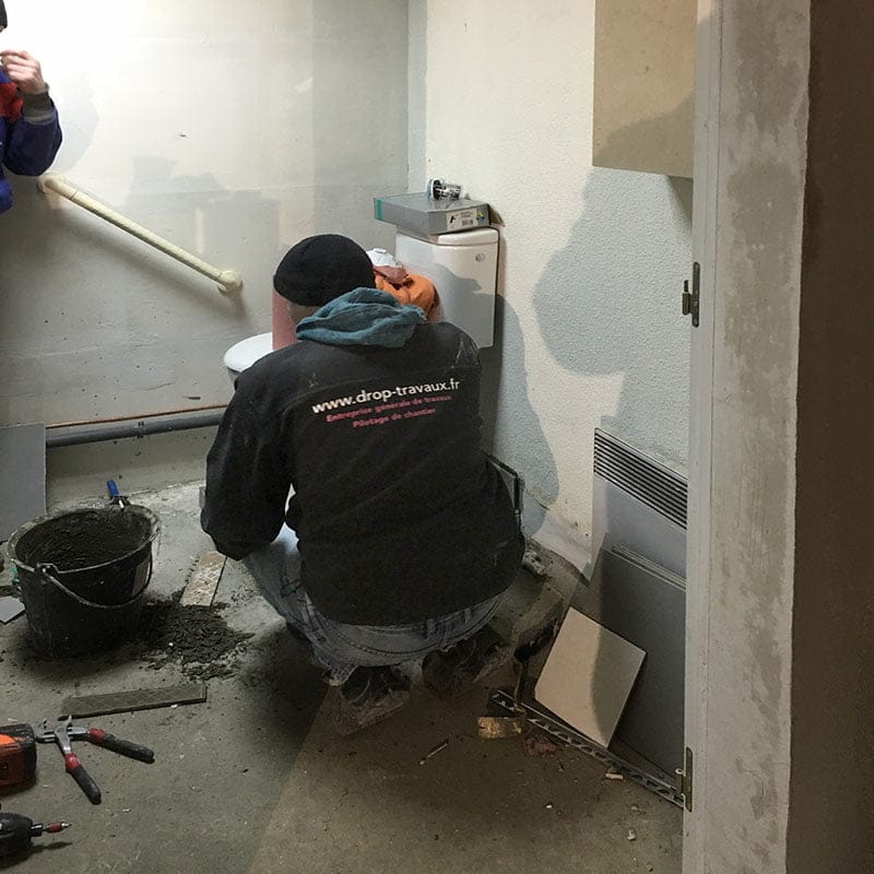 Après le nettoyage complet des surfaces à remettre en état et enlèvement des matériaux, les corps d’état vont se suivre. Les électriciens préparent les alimentations reprennent et mettent aux normes l’installation existante. Les plombiers changent les sanitaires défectueux et installent les nouveaux sanitaires PMR en même temps que les plaquistes montent les nouvelles cloisons en BA13, menuisiers et carreleurs suivent les opérations.